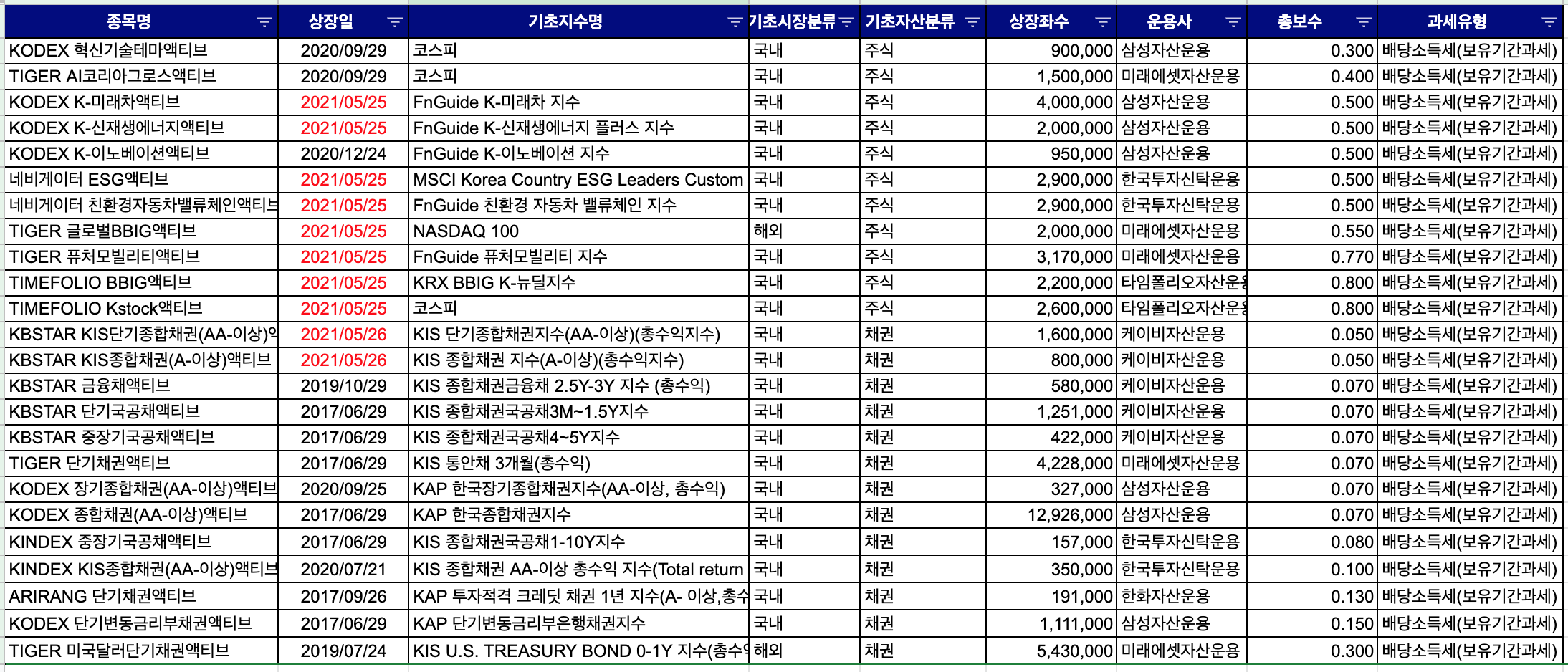| 종목명 | 상장일 | 기초지수명 | 기초시장분류 | 기초자산분류 | 상장좌수 | 운용사 | 총보수 | 과세유형 |